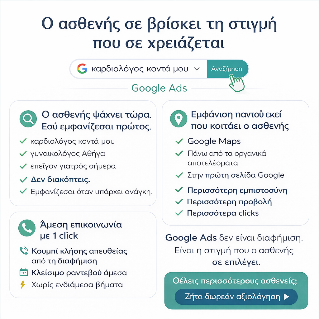 Το 2026, η αναζήτηση ιατρικών υπηρεσιών στη Google αυξήθηκε κατά 47%. Εσύ θα μείνεις εκτός; Προσελκύστε ασθενείς την στιγμή που αναζητούν την ειδικότητά σας, με στοχευμένες καμπάνιες Google Search Ads, χτίζοντας ένα ισχυρό ιατρείο.