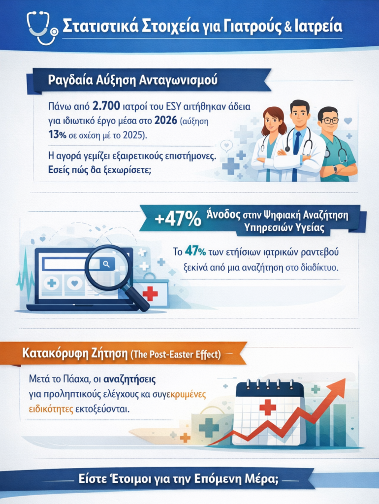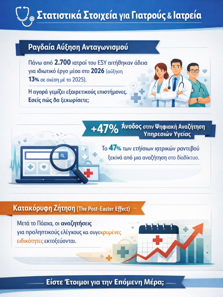 - Ραγδαία Αύξηση Ανταγωνισμού: Πάνω από 2.700 ιατροί του ΕΣΥ αιτήθηκαν άδεια για ιδιωτικό έργο μέσα στο 2026 (αύξηση 13% σε σχέση με το 2025) καθώς επίσης πρέπει να ληφθούν υπόψη και οι αιτήσεις ιδιωτών ιατρών για νέα ιατρεία. Εσείς πώς θα ξεχωρίσετε;
